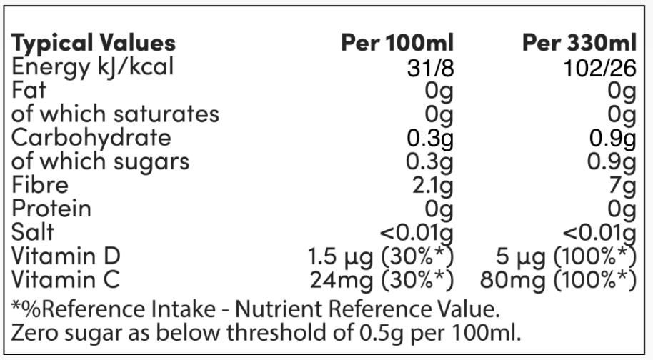 Sparkling spring water, chicory root inulin, natural flavouring, acid; tartaric acid, plant-based sweetener; steviol glycosides from stevia, vitamins C and D, lactic acid bacillus.